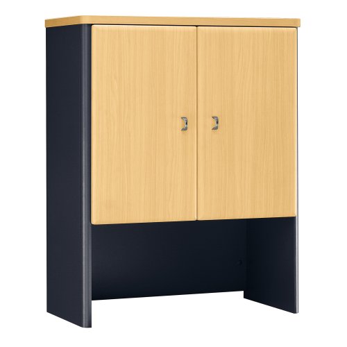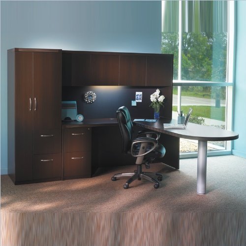 From a small office that relies on space efficiency to a multiple-employee work area to the CEO's high-powered suite, Bush Furniture's Quantum collection offers options to design the perfect configuration. This left storage tower pairs with any of Quantum's 24-inch-deep work surfaces to complete a 6- or 8-foot footprint. Designed for versatile use, it includes a file drawer for letter- or legal-size files and a box drawer for miscellaneous supplies, with a central lock that secures them both. There's also a vertical locker with its own lock for tall items, as well as an open shelf and cubbyhole. Along the back panel, the large, fabric-covered tack board accepts paper trays or metal marker boards, and a low-profile cutout allows cords and wires to snake away neatly and inconspicuously. Crafted of durable melamine with a warm Modern Cherry finish and sleek satin-silver accents, this piece presents a clean, contemporary style for today's office decors. Its measurements are 23-1/8 inches wide by 23-1/2 inches deep by 53 inches high. Some assembly is required, though the tower comes with timesaving, install-ready features. Instructions and a toll-free customer help line are also included. Ships in two boxes. Ten-year warranty.
